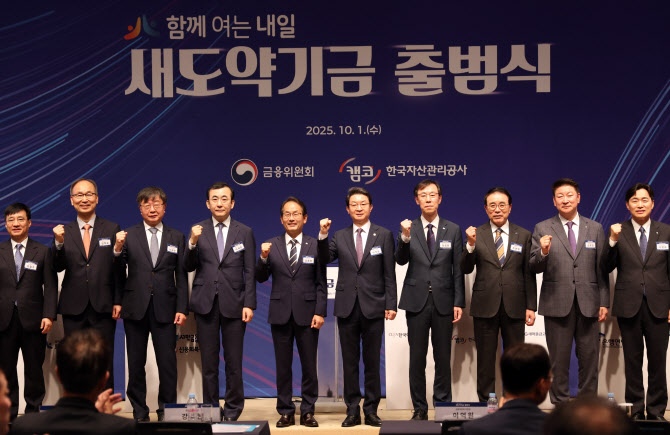 이달 1일 서울 중구 프레스센터에서 열린 새도약기금 출범식에서 이억원(오른쪽 다섯째) 금융위원장을 비롯한 참석자들이 기금 협약서에 서명한 뒤 기념촬영을 하고 있다. (사진=연합뉴스