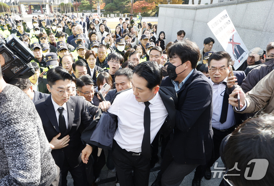 장동혁 국민의힘 대표가 6일 광주를 찾아 국립 5·18민주묘지를 참배하기 위해 들어서자 광주전남촛불행동 회원들이 몸싸움을 하며 막아서고 있다. 2025.11.6/뉴스1 …