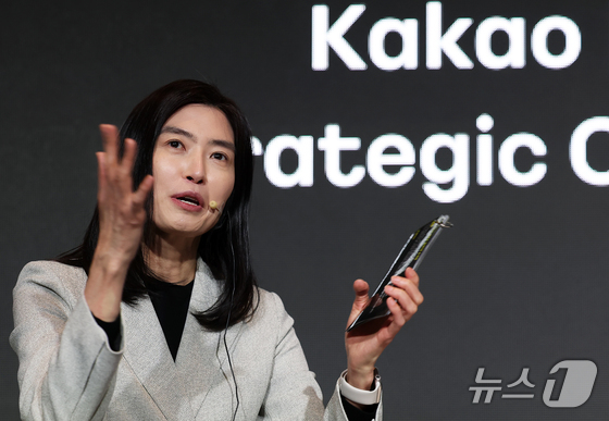 정신아 카카오 대표와 일 서울 중구 플라자호텔에서 열린 오픈AI 전략적 제휴 체결 공동 기자간담회에서 발언하고 있다. 카카오는 국내 기업으로는 처음으로 오픈AI와 전략…