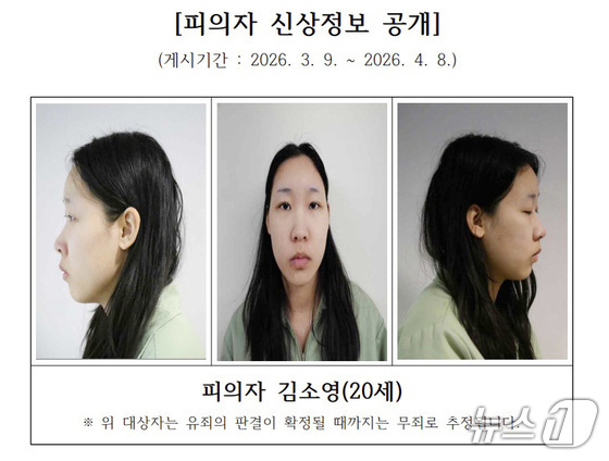 '모텔 약물 연쇄살인' 피의자인 김소영 씨20·여의 신상이 공개됐다. 서울북부지검 제공. 재판매 및 DB 금지 2026.3.9 &c…