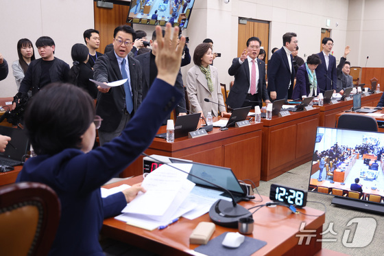 국민의힘 의원들이 24일 서울 여의도 국회에서 열린 법제사법위원회 전체회의에서 전남광주통합특별시 설치를 위한 특별법안대안에 대한 거수 표결에 항의하고 …