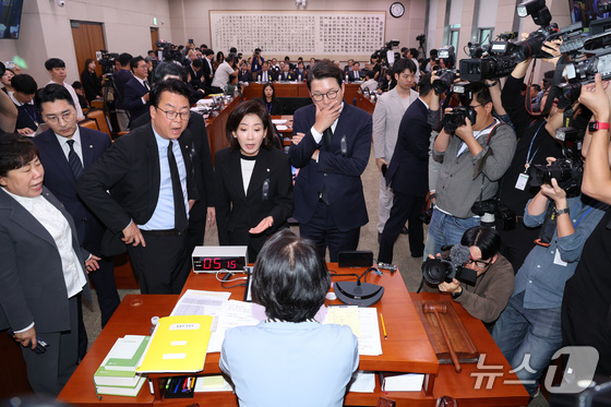 나경원 의원을 비롯한 국민의힘 법사위원들이 지난달 일 서울 여의도 국회에서 열린 법제사법위원회의 대법원 등에 대한 국정감사에서 조희대 대법원장 이석과 관련해 추미애 …