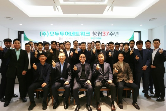 모두투어 창립 37주년 기념행사 임원 및 부서장 단체 사진모두투어 제공 뉴스1 윤슬빈 관광전문기자모두투어080160)…