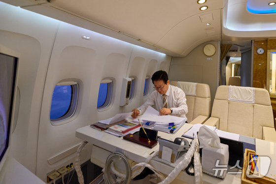 이재명 대통령이 19일현지시간 UAE 국빈 방문을 마치고 다음 순방지인 이집트로 향하는 공군 1호기 내에서 집무를 보고 있다. 이재명 대통령 …