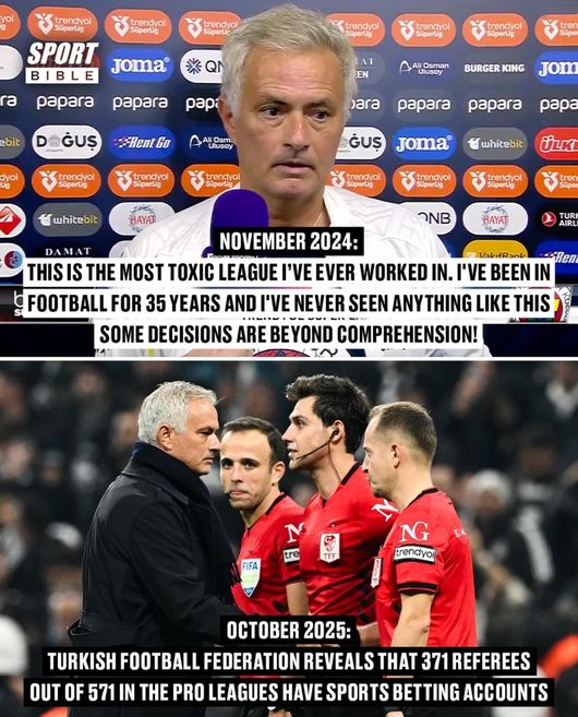 "나는 시스템과 싸웠다" 무리뉴의 발언, 또 재조명...튀르키예 심판 152명 불법 베팅 적발
