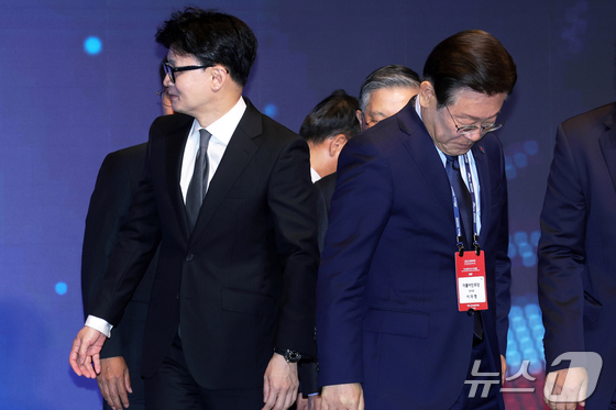 한동훈 전 국민의힘 대표왼쪽와 이재명 대통령이 여야 대표 시절이던 지난 2024년 10월 23일 서울 종로구 포시즌스호텔에서 열린 중앙포럼에 참석했을 …