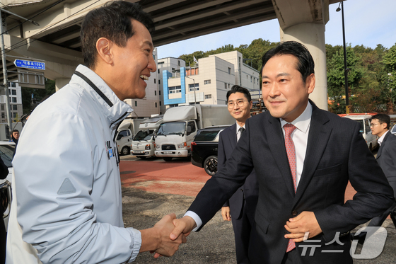 2025년 10월 24일 오전 서울 노원구 상계5 재정비촉진구역을 찾은 장동혁 국민의힘 대표와 오세훈 서울시장이 인사를 나누고 있다. 공동취재 202…
