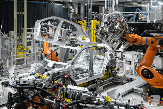지난달 28일현지시각 슬로바키아 수도 브라티슬라바 외곽의 폭스바겐그룹 공장 내 카이엔 일렉트릭 전용 플랫폼 홀에서 카이엔 일렉트릭의 차체와 차대가 로봇…