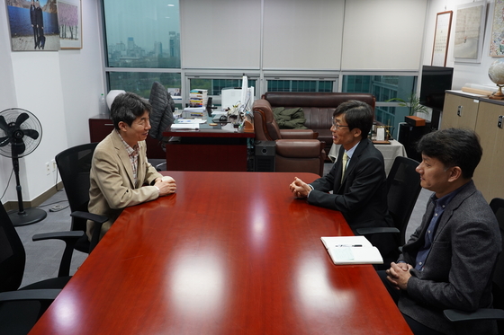 송상교 진실·화해를위한과거사정리위원회진실화해위 위원장이 6일 국회를 방문해 윤건영 더불어민주당 의원과 대화하는 모습.진실화해위 제공…