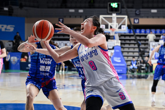 용인 삼성생명 이주연이 15일 충남 아산이순신체육관에서 열린 2025-26 여자프로농구 아산 우리은행전에서 종료 4초 전 골밑슛을 넣어 58-56 승리를 이끌었다. …
