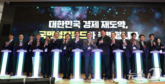 이억원 금융위원장, 박현주 미래에셋 회장, 서정진 셀트리온그룹 회장 등 참석자들이 11일 서울 여의도 산업은행 본점에서 열린 국민성장펀드 출범식에서 기념촬영을 하고 있다…