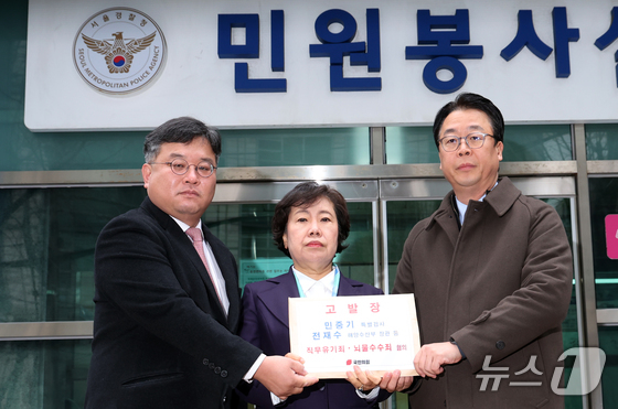 국민의힘 조배숙 사법정의수호 및 독재저지특위 위원장, 곽규택 법률자문위원장이 11일 서울 종로구 서울지방경찰청에서 통일교 금품수수 의혹 관련 민중기 특별검사 및 수사팀을…