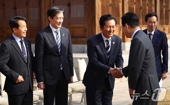 이재명 대통령이 지난 16일 청와대 상춘재에서 열린 정당 지도부 초청 오찬에서 정청래 더불어민주당 대표와 악수를 나누고 있다. 청와대통신사진기자단 20…