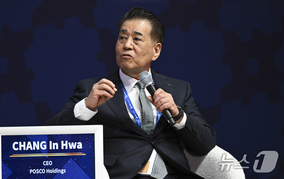 장인화 포스코 회장이 일 오전 경북 경주 예술의전당에서 열린 APEC CEO 서밋 ‘탄력적이고 친환경적인 글로벌 공급망 구축’ 세션에서 발언하고 있다. 공동…