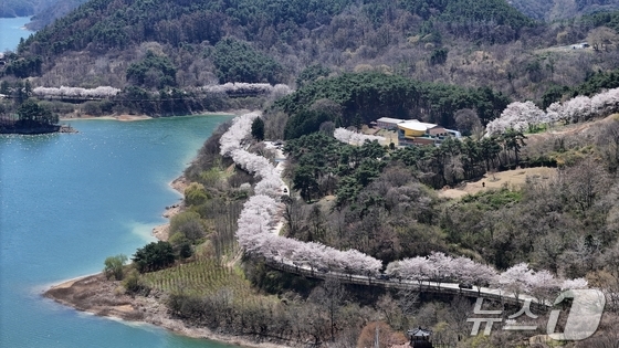 7일 전북 임실군 옥정호 순환도로를 따라 만개한 벚꽃이 푸른 호수와 어우러져 장관을 이루고 있다. 임실군청 제공. 재판매 및 DB 금지 2026.4.7…