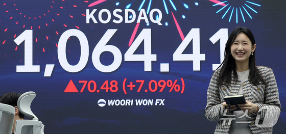 26일 서울 중구 우리은행 본점 딜링룸 현황판에 코스닥 지수가 전장보다 70.48포인트7.09% 오른 1,064.41이 나타나고 있다. 이날 코스닥 지…