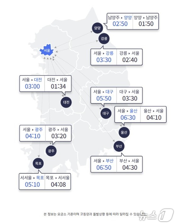 15일 오전 10시 기준 서울과 지방 주요 도시간 고속도로 이동 예상 소요시간 한국도로공사 홈페이지 갈무리토요일인 25일은 단풍 나들이가 막바지…