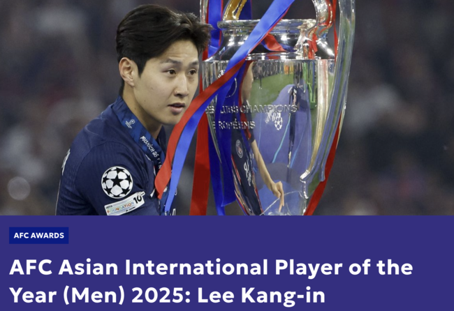 [OSEN=서정환 기자] '한국 축구의 새로운 상징' 이강인(24, 파리 생제르맹)이 아시아축구연맹(AFC) '올해의 인터내셔널 선수'로 선정됐다. AFC는 17일 사우디아라비아