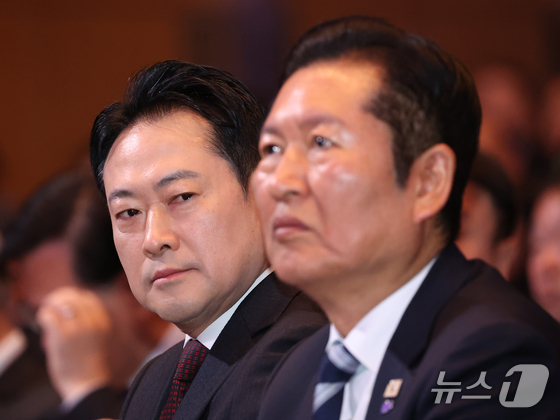 정청래 더불어민주당 대표오른쪽와 장동혁 국민의힘 대표가 1일 서울 강남구 코엑스에서 열린 제107주년 3·1절 기념식에 참석해 자리하고 있다. 2026…