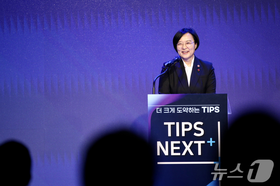 한성숙 중소벤처기업부 장관이 18일 서울 종로구 포시즌스호텔에서 열린 '팁스 성과공유회'에서 인사말을 하고 있다. 중소벤처기업부 제공. 재판매 및 DB 금지…