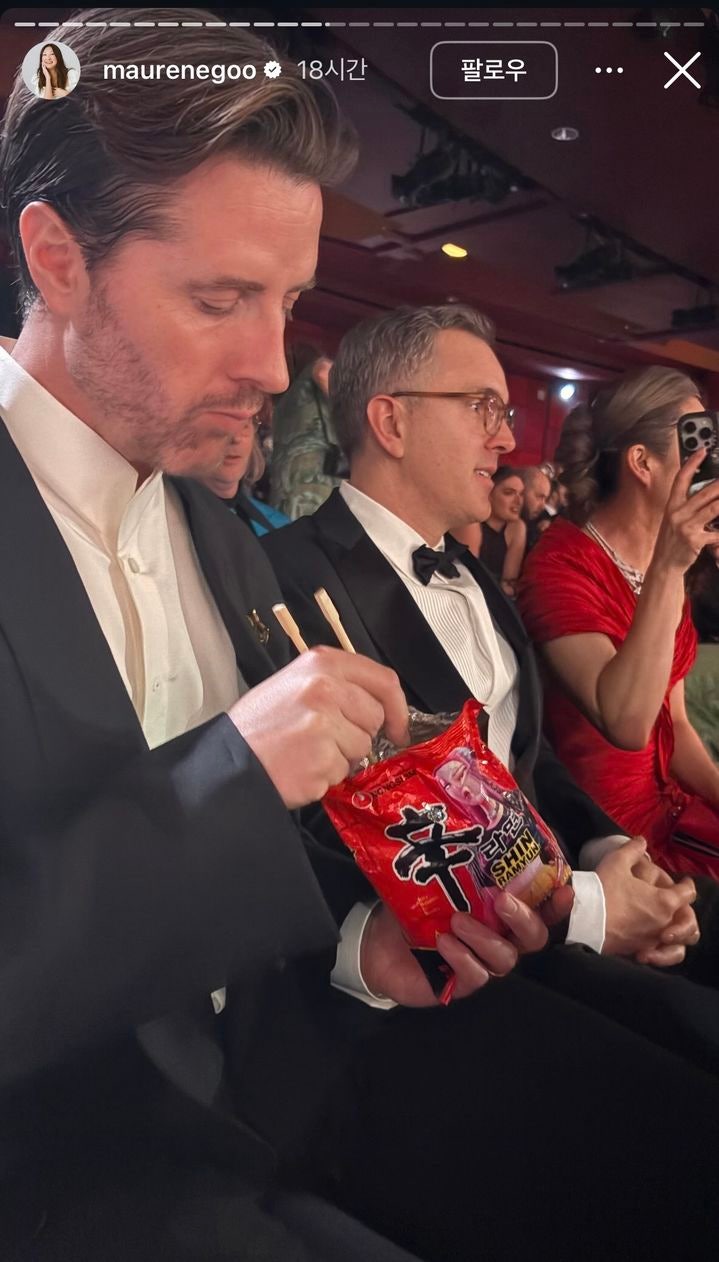 "AI인 줄"…아카데미 시상식서 생라면 먹는 '케데헌' 감독 포착 [소셜in]