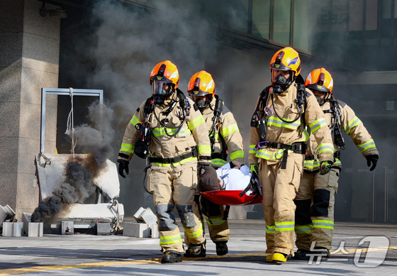 29일 서울 광진구청에서 열린 ‘안전 한국 훈련 긴급종합훈련‘에서 실제 화재현장을 가정하여 소방관들이 구조작전을 펼치고 있다. 2025.10.29/뉴스1 N…
