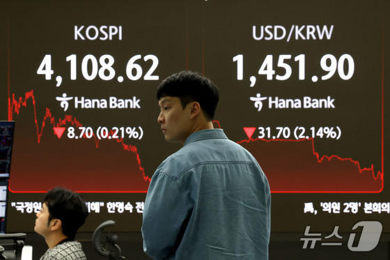코스피 지수가 하락 마감한 24일 서울 중구 하나은행 본점 딜링룸 현황판에 전장보다 8.70포인트0.21% 하락한 4,108.62를 나타내고 있다. 이…