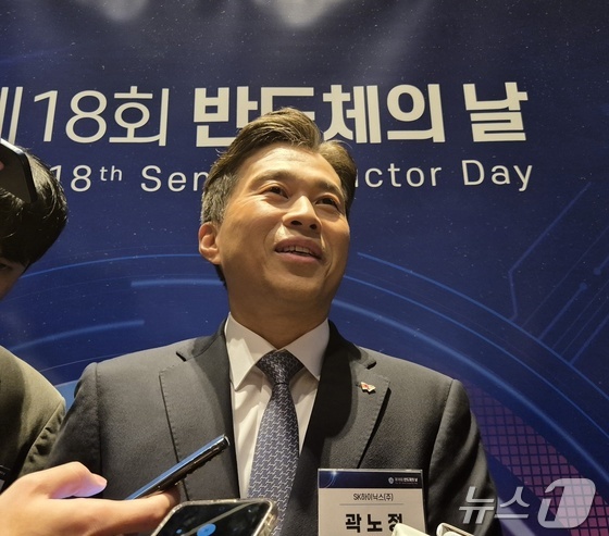 곽노정 SK하이닉스 대표이사 사장이 일 강남구 그랜드 인터컨티넨탈 서울 파르나스에서 열린 제회 반도체의 날 행사에 참석하기 전 기자들과 질의응답을 하고 있다. …