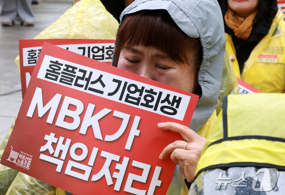 민주노총 서비스연맹 마트산업노조 지부 회원들이 14일 서울 종로구 MBK파트너스 앞에서 열린 'MBK가 책임져라 확대간부 결의대회'에서 삭발하는 안수용 지부장을 지켜보며…