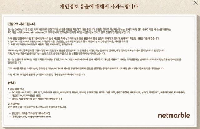 넷마블, ‘바둑·장기’PC 게임 사이트 고객정보 유출 정황
