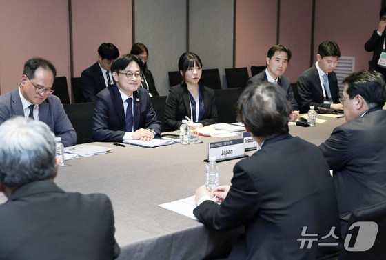 김정관 산업통상부 장관이 일 경북 경주시 소노캄호텔에서 아카자와 료세이 일본 경제산업성 대신과 면담을 갖고 있다. 산업통상부 제공. 재판매 및 DB 금지…