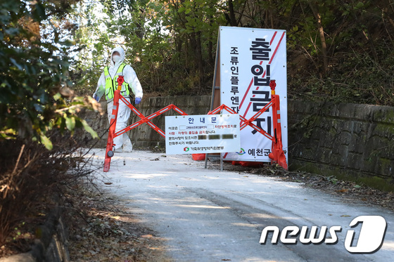 고병원성 조류인플루엔자AI 확진과 관련해 가축위생방역지원본부 관계자들이 농장 입구를 통제하고 있다. 2022.10.19 뉴스1 공정식 기자…