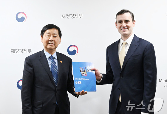 구윤철 부총리 겸 재정경제부 장관이 19일 서울 종로구 정부서울청사에서 댄 카츠 IMF 수석 부총재와 기념촬영을 하고 있다. 재정경제부 제공. 재판매 및 DB …