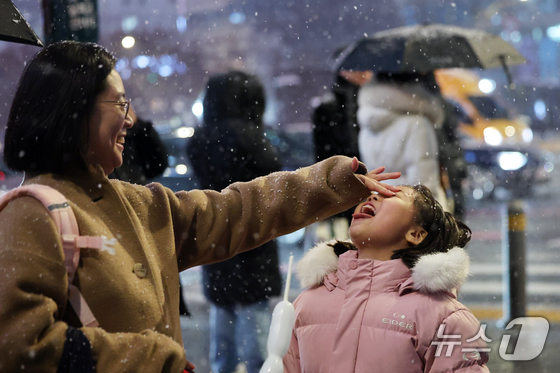 첫눈이 내린 4일 오후 서울 광화문 네거리에서 어린이가 첫눈을 맛보고 있다. 2025.12.4/뉴스1 News1 황기선 기자"첫 눈은 낭만이 있잖아요…