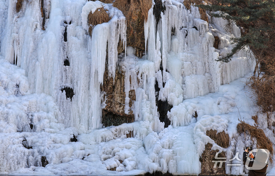 아침기온이 영하10도 밑으로 떨어진 6일 서울 서대문구 홍제천 인공폭포가 얼어붙어 있다. 2026.2.6 / 뉴스1 이호윤 기자토요일인 7일은 전국 …