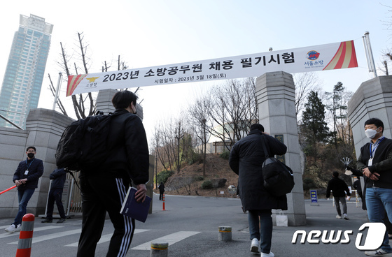 18일 오전 서울 강남구 영동대로 경기고등학교에 마련된 2023년 소방공무원 채용 필기 시험장으로 응시자들이 들어가고 있다. 2023.3.18 뉴스1 박정호…