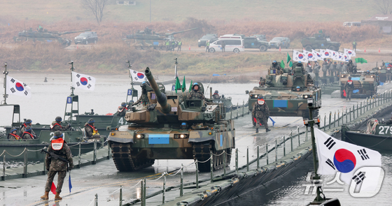 25일 경기 여주시 남한강 일대 훈련장에서 호국훈련의 일환으로 실시한 도하훈련에서 육군 제7공병여단 장병들과 제8기동사단 장병들이 부교 도하 훈련을 하고 있다.…