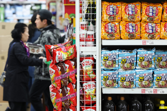 6일 서울의 한 대형마트에 라면과 과자가 진열되어 있다. 중동 전쟁 장기화로 국제유가가 배럴당 110달러를 넘어선 가운데, 환율과 금리까지 동반 상승하며 물가 압력이 본…