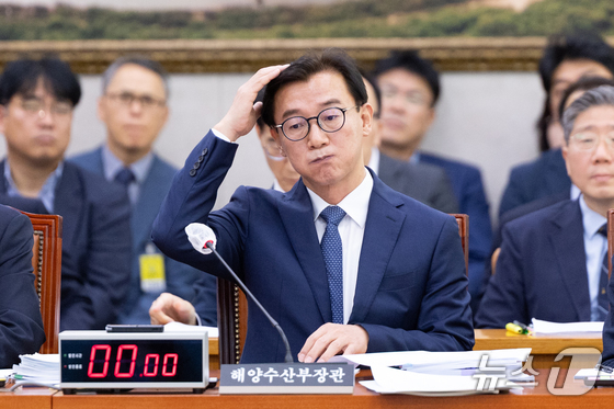 전재수 해양수산부 장관이 일 서울 여의도 국회에서 열린 농림축산식품해양수산위원회 해양수산부 등에 대한 국정감사에 출석해 머리를 쓸어넘기고 있다. ../…