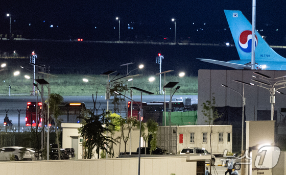 지난 일현지시간캄보디아 당국의 범죄단지 단속으로 적발돼 현지 유치장에 구금됐던 한국인들이 탑승한 버스가 태초국제공항에서 대한항공 전세기로 이동하고 …