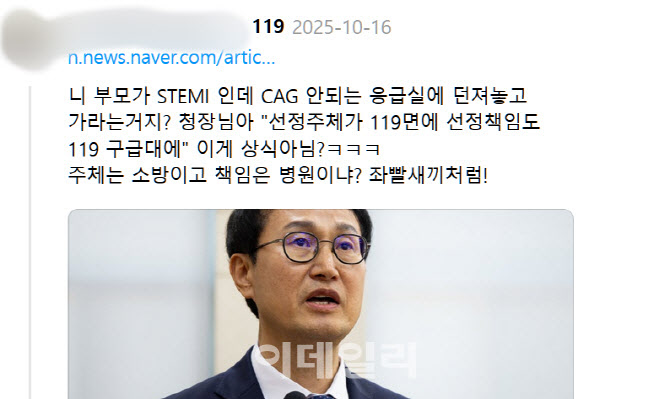 [이데일리 안치영 기자] 현직 응급의학과 의사로 추정되는 인물이 SNS로 소방청장 직무대행과 119구급대를 원색 비난하는 글을 올린 가운데, 대한응급의학회 이사장이 ‘있어서는 안