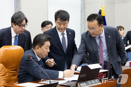 18일 서울 여의도 국회에서 열린 제429회국회정기회 운영위원회 제5차 전체회의에서 김병기 위원장이 문진석 더불어민주당 원내수석부대표, 유상범 국민의힘…