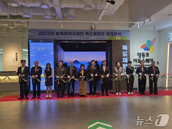 일 동북아역사재단 독도체험관 재개관식에서 참석자들이 테이프 커팅식을 진행하고 있다. 뉴스 김정한 기자동북아역사재단은 일 오후 서울 영등포구 …