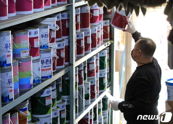 KCC와 노루·삼화·제비 등 페인트 업체들이 자동차보수용 페인트 가격을 줄줄이 인상했다. 사진은 서울의 한 페인트 판매 대리점에서 관계자가 물품을 정리하는모습. 뉴스1 …