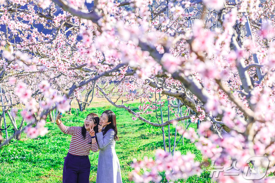 8일 경북 청도군 각남면 칠성리 한 복숭아 밭에 복사꽃이 만발한 가운데 봄 나들이 나선 시민들이 활짝 핀 봄꽃을 배경으로 사진을 찍으고 있다. 청도군 제공. 재…