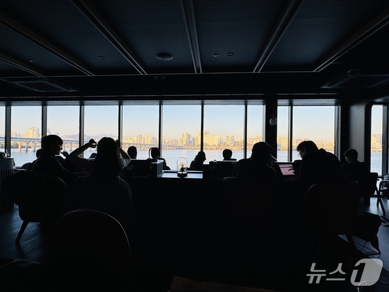 정전으로 불이 꺼진 서울 여의도 한강버스 선착장 층 스타벅스 내부. 일부 손님들이 어둑한 매장에서 한강을 바라보고 있다. ../뉴스 ⓒ News 한지명…