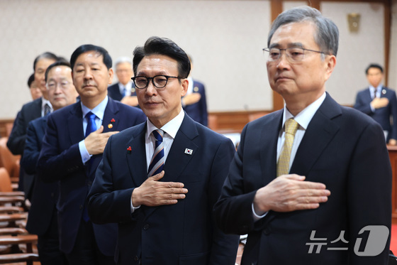 김민석 국무총리 및 국무위원들이 31일 서울 종로구 정부서울청사에서 열린 임시 국무회의에서 국민의례를 하고 있다. 2025.12.31/뉴스1 News1 임세…