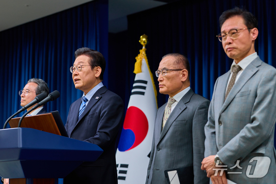 이재명 대통령이 14일 서울 용산 대통령실 청사에서 한·미 팩트시트 타결 결과를 발표하고 있다. 왼쪽부터 김용범 정책실장, 이 대통령, 위성락 국가안보실장, 이규연 홍보…