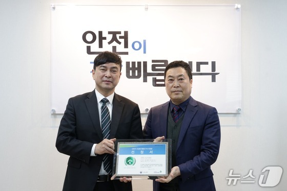 김중혁 태광그룹 레저·인프라 계열사 티시스 CS사업본부장오른쪽과 한국산업안전보건공단 이윤규 남부지사장이 23일 근로자 건강증진활동 우수사업장 선정서를 …