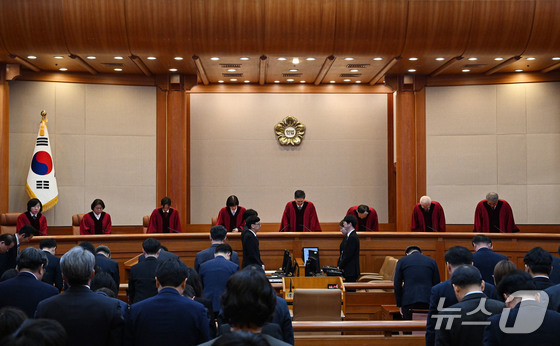 문형배 권한대행을 비롯한 헌법재판관들이 4일 오전 서울 종로구 헌법재판소 대심판정에서 열린 윤석열 대통령 탄핵 심판에 참석하며 인사하고 있다. 이날 헌법재판소는 재판관 …
